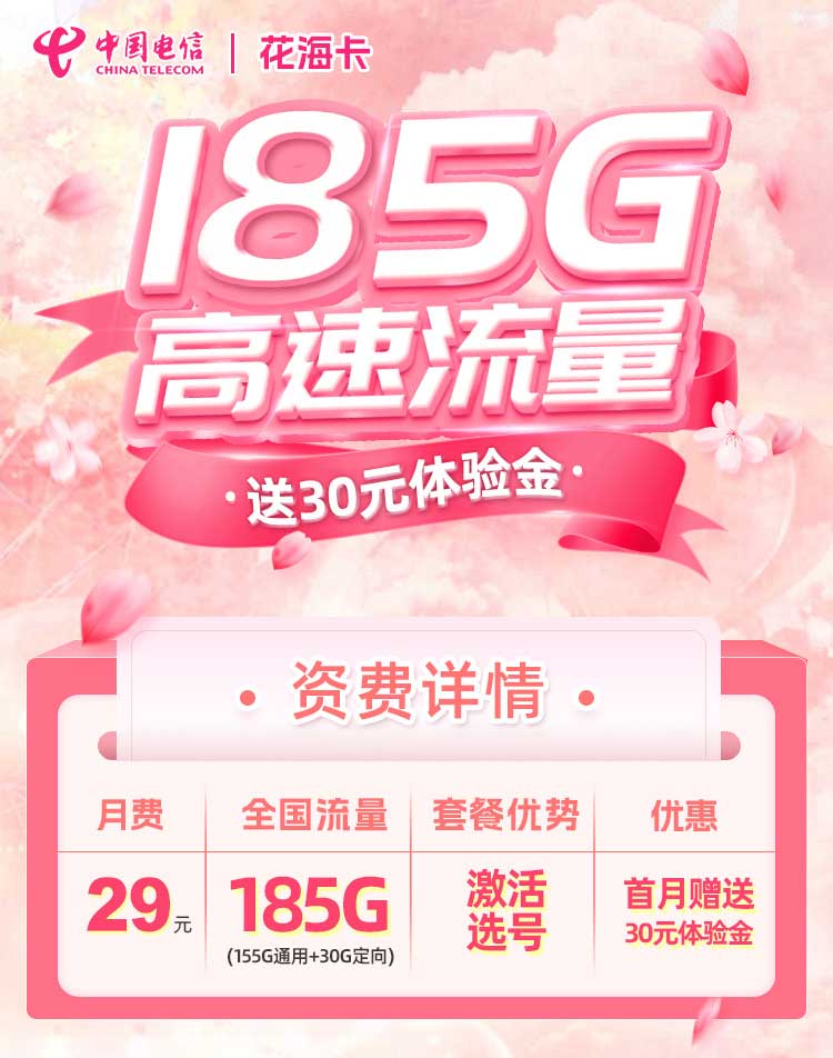 点击图片领取 月租:29元 流量:185G/月(含155G通用+30G定向) 通话:0.1元/分钟 短信:0.1元/条 套外:流量超出按5元/GB收取 合约期:无,随时可以线上销户 没有复杂充送话费活动,一直固定29月租。激活后当月获得30元话费,激活当月即使用,不退返现金,相当于首月免月租 首充100激活长期优惠29月租每月185G,这100并非购卡费,是这张卡的话费,等于首充可以首月+3个月不用交话费。 卡没有合约期随时可以销户,优惠期20年,电信承诺只要一直用,一直都是29元185G Ps:激活首月定向流量根据剩余天数到账,例如你15日收到,就给14G流量,次月1日全额到账;刚刚激活需要电信完成数据交互流量才到账,注意不要用超。 归属地:随机归属地 不影响网速,卡在全国(除港澳台)都能使用 办理年龄:18-65周岁 禁发地:北京、西藏、新疆(以运营商审核为准) 激活方式:拿了快递,根据快递单上的指引扫码自己激活,激活时候可以自己选号码