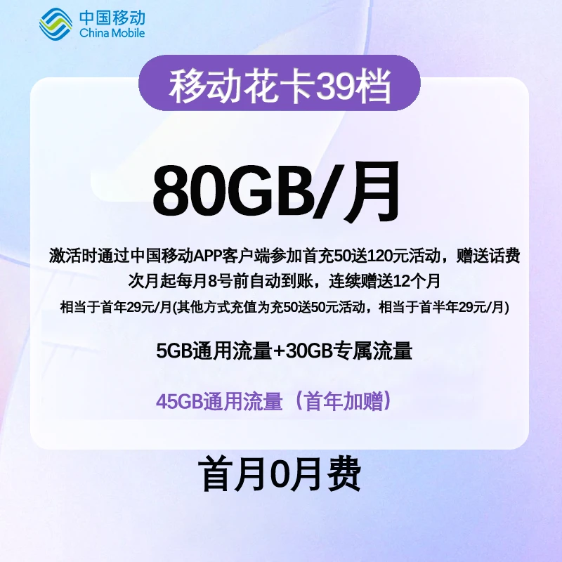 下面是一款移动流量卡套餐,每个月80G流量,优惠月租仅需29元/月,信号超级强劲。